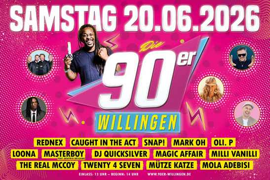 „Die 90er Willingen“, in ein pulsierendes Herz dieser Zeit. Von 14:00 bis 22:00 Uhr werden Künstler wie Oli. P, Loona, Mark OH, Snap!, Rednex, und viele weitere auf der Bühne stehen.